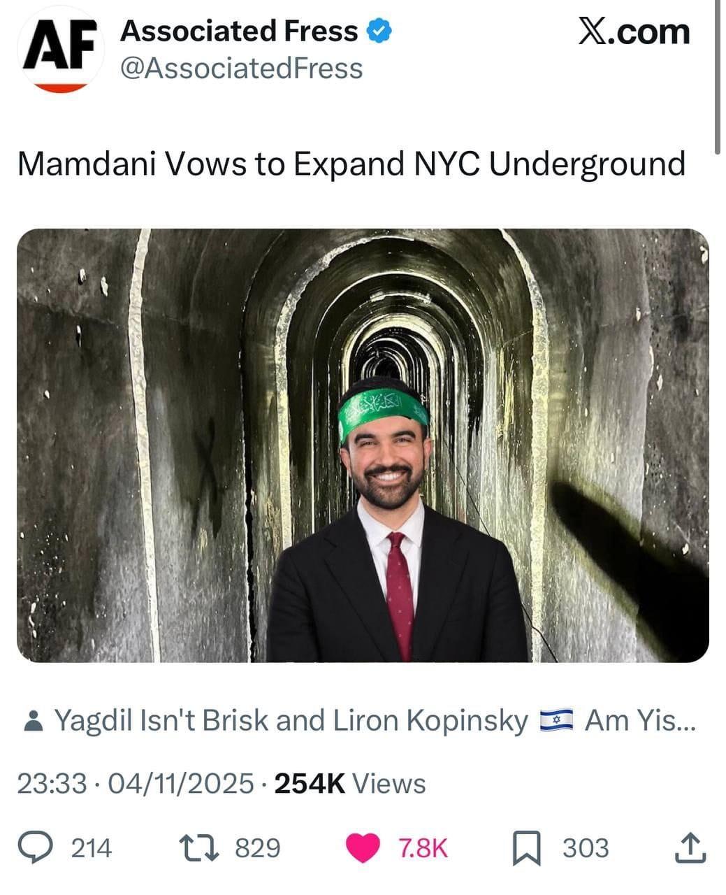 وبالنسبة لموقع ميرلين العبري فقد وضع صورة لممداني مرتديََا شارة كتائب القسام من داخل نفق بعنوان: «ممداني يتعهد بتوسيع نطاق مترو أنفاق مدينة نيويورك».